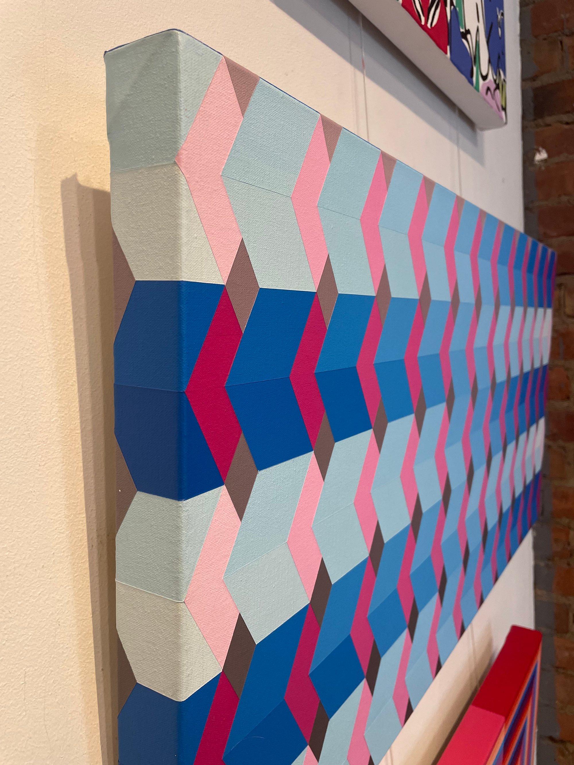 that explore the visual impact and language of colour. Colour is a powerful language, evoking emotion and transforming mood beyond words. My bold, geometric paintings explore this language through structured forms and shifting hues, creating optical effects that appear to shimmer and move. While order and precision define my work, subtle imperfections—pencil marks and delicate irregularities—reveal the human